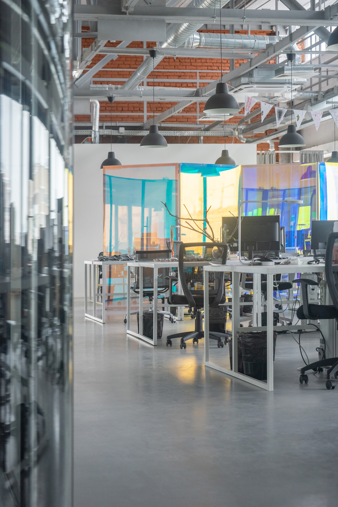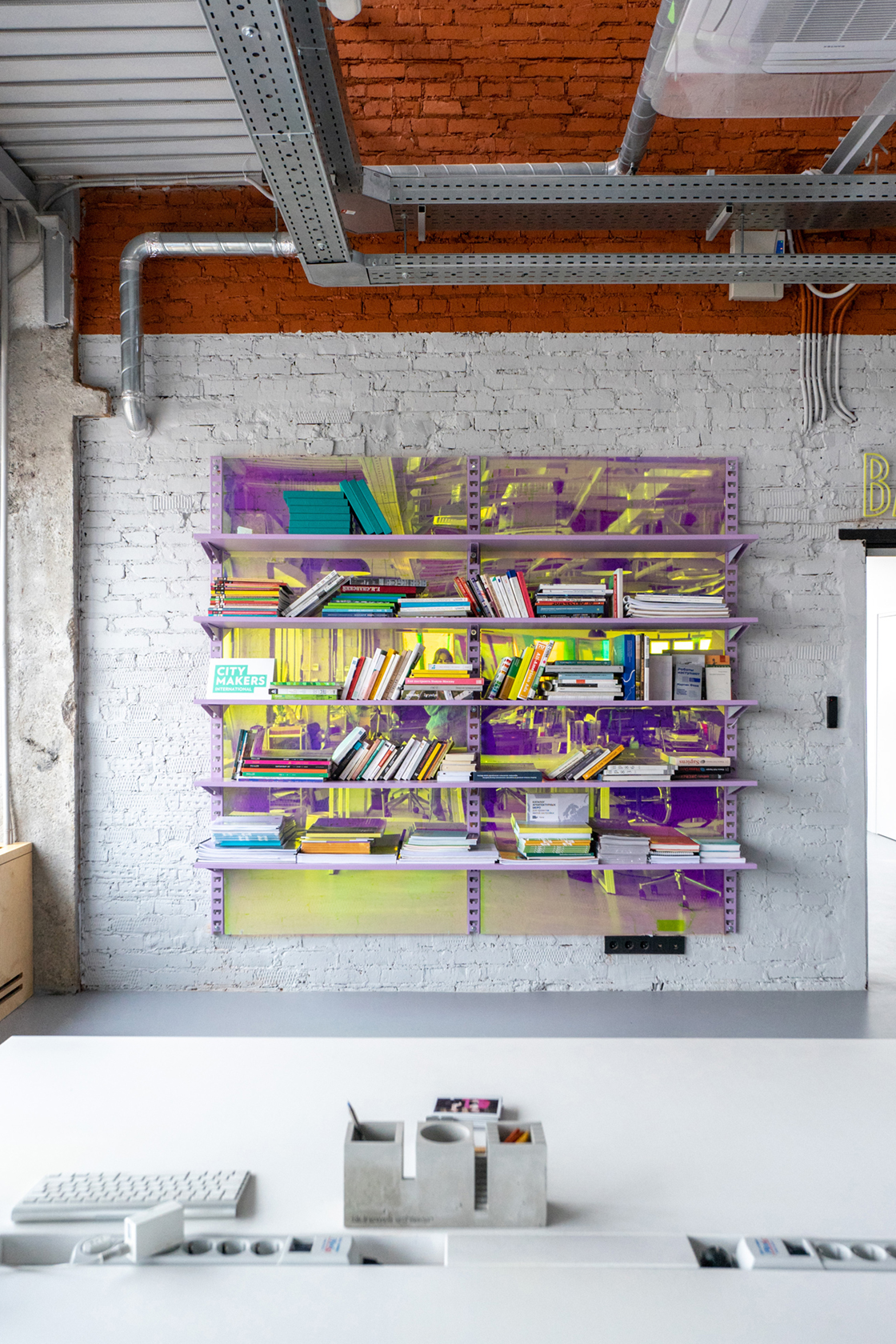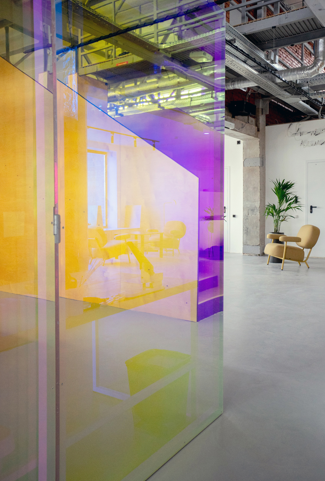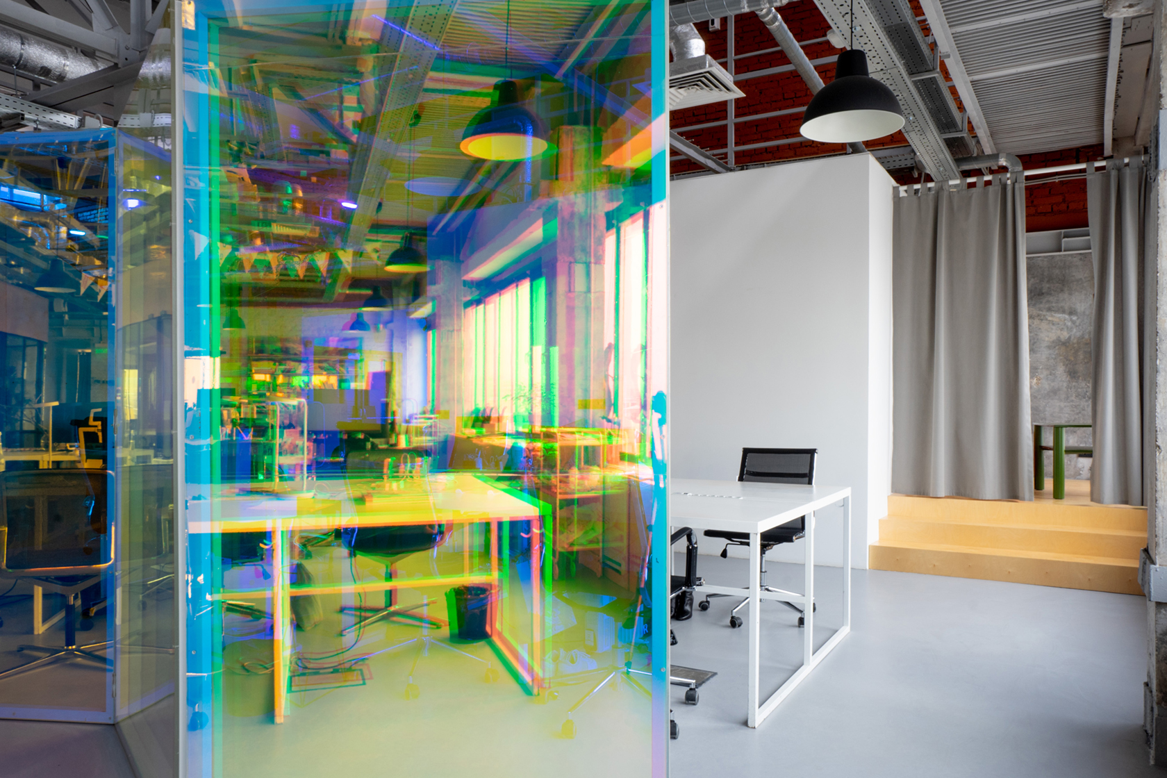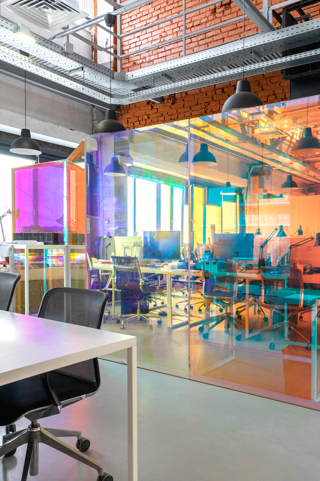 На фоне промышленного пространства 60-х годов появляются новые цветовые пятна мебели и оборудования. Яркое и нетривиальное - как отражение деятельности творческого коллектива компании
