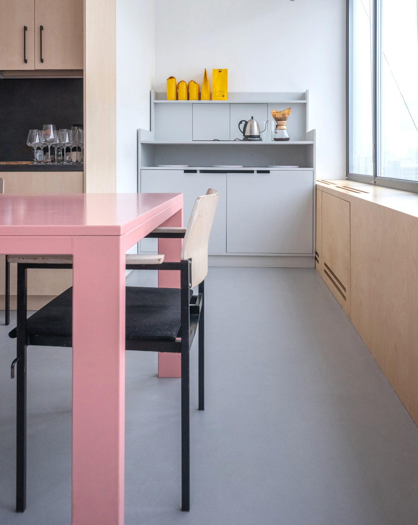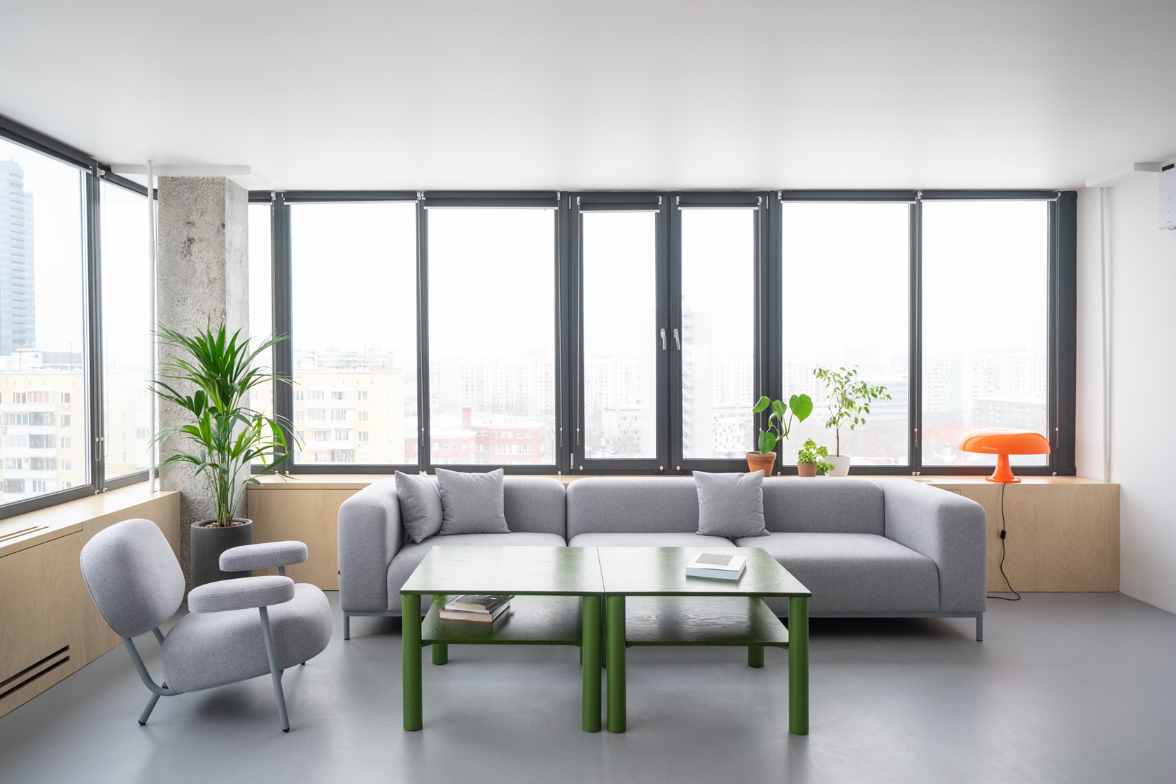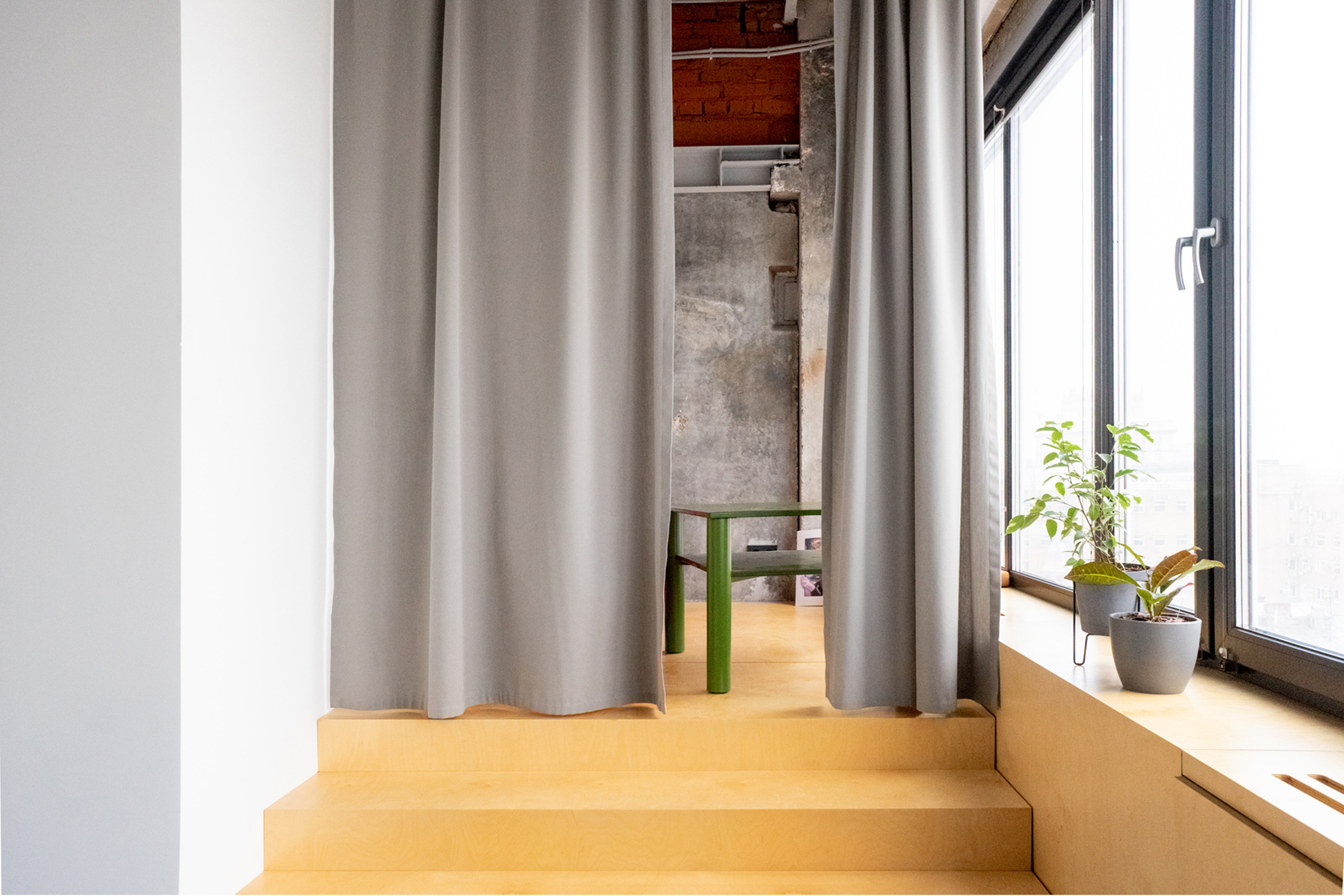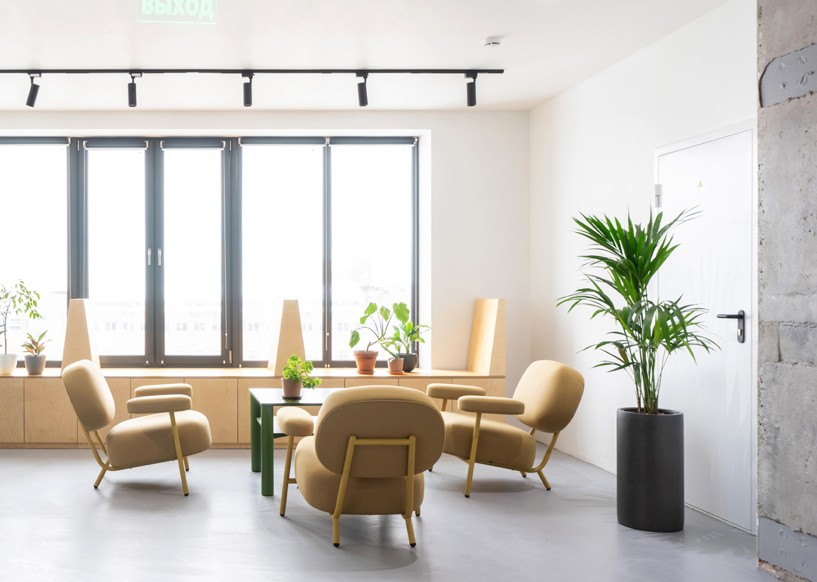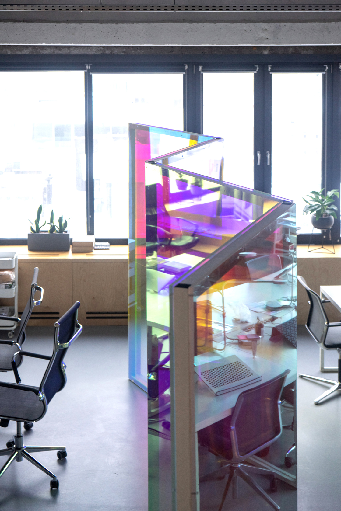 На фоне промышленного пространства 60-х годов появляются новые цветовые пятна мебели и оборудования. Яркое и нетривиальное - как отражение деятельности творческого коллектива компании