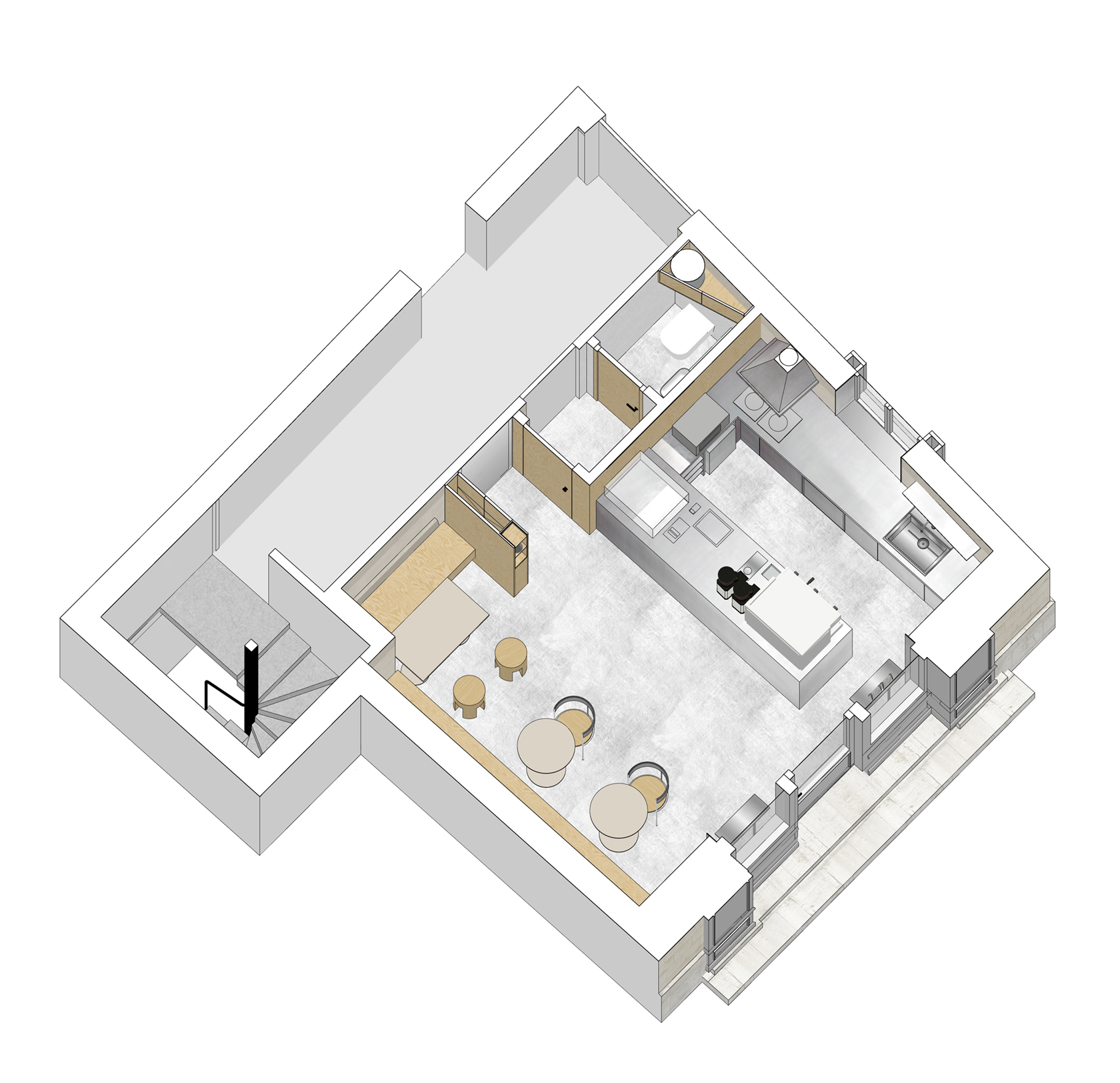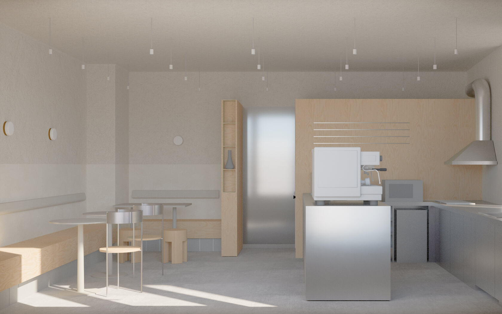 Interior of the tiny coffee shop in the historic centre of Libourne was designed in "international" style. The concept is shaped by a deliberate rejection of the contextual background. The design is tied neither to place nor to time.